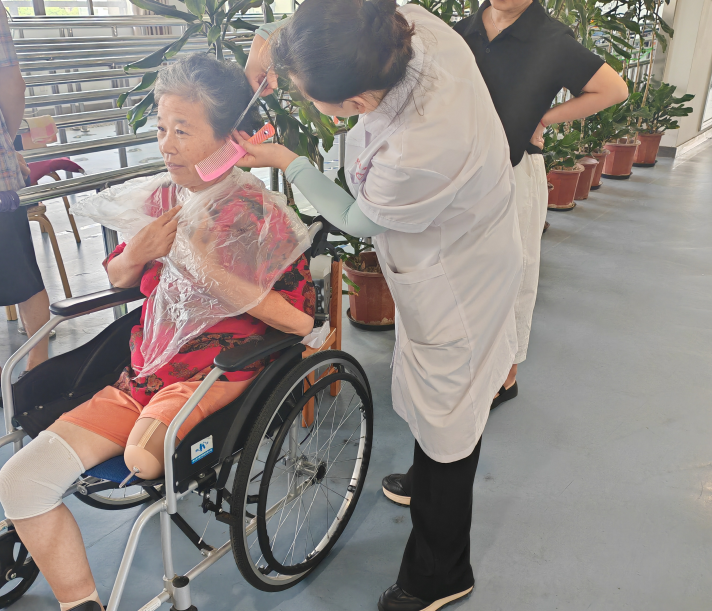 训练间隙,阿姨念叨着自己头发长了,还有不少白头发,显得没精神。徐姐听在心里,当天下午就带来了理发工具和染发剂,利用休息时间为阿姨剪发、染发。当镜子里出现一头清爽黑发的自己时,阿姨笑的很开心,还这么关心我,你们服务真好啊!”